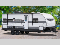 Camping with friends has never been so easy than in this cozy travel trailer. Once you arrive at your destination, prepare lunch on the three burner cooktop and you can dine at the booth dinette. Your guest can make this area their bed at night, along with the jack knife sofa. There is a front master bedroom with a queen bed that will feel just like home, and the two wardrobes provide a place for all your clothes. Head outside to find a pass-through storage, additional outside storage, plus an electric awning with LED lights!