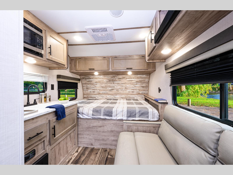 Sleeps 2 Length 18 ft 2 in Ext Width 6 ft 9 in Ext Height 9 ft 2 in Int Height 6 ft Hitch Weight 360 lbs Dry Weight 2410 lbs Cargo Capacity 1450 lbs Fresh Water Capacity 18 gals Grey Water Capacity 27 gals Black Water Capacity 27 gals Furnace BTU 20000 btu Available Beds Queen RV Refrigerator Type Gas/Electric Cooktop Burners 2 LP Tank Capacity 20 lbs Water Heater Capacity 6 gal Water Heater Type DSI Gas AC BTU 5000 btu Axle Count 1 Number of LP Tanks 1 Shower Type Wet/Bath Shower Solar Wattage 100 watts