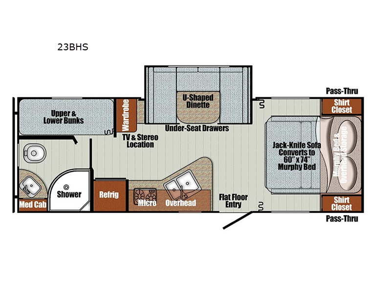 Pack your bags, load the kids, and hitch up this travel trailer! The kids will enjoy a good night's rest on the rear corner bunk beds with privacy curtain, and you will enjoy the front jackknife sofa that converts into a Murphy bed. The U-shaped dinette slide can also transform into an extra sleeping space and it has under-seat drawers to store your games. The wardrobe by the bunks has a TV and stereo location for your entertainment, and the rear corner bathroom has a radius shower for everyone to stay clean and fresh!