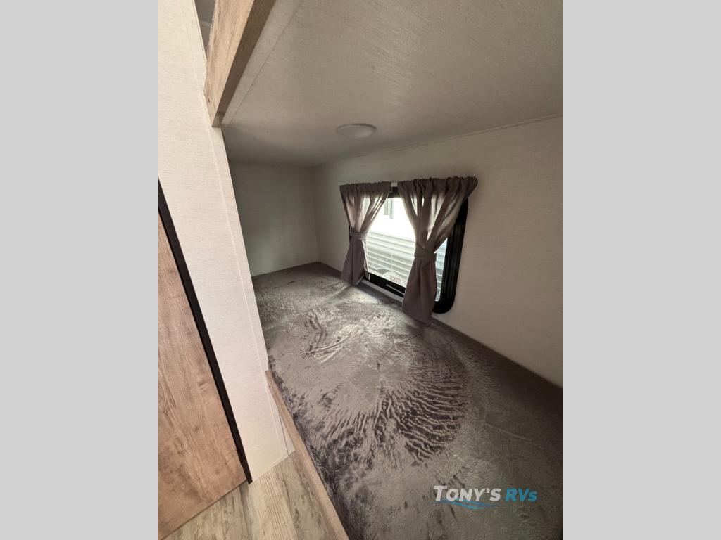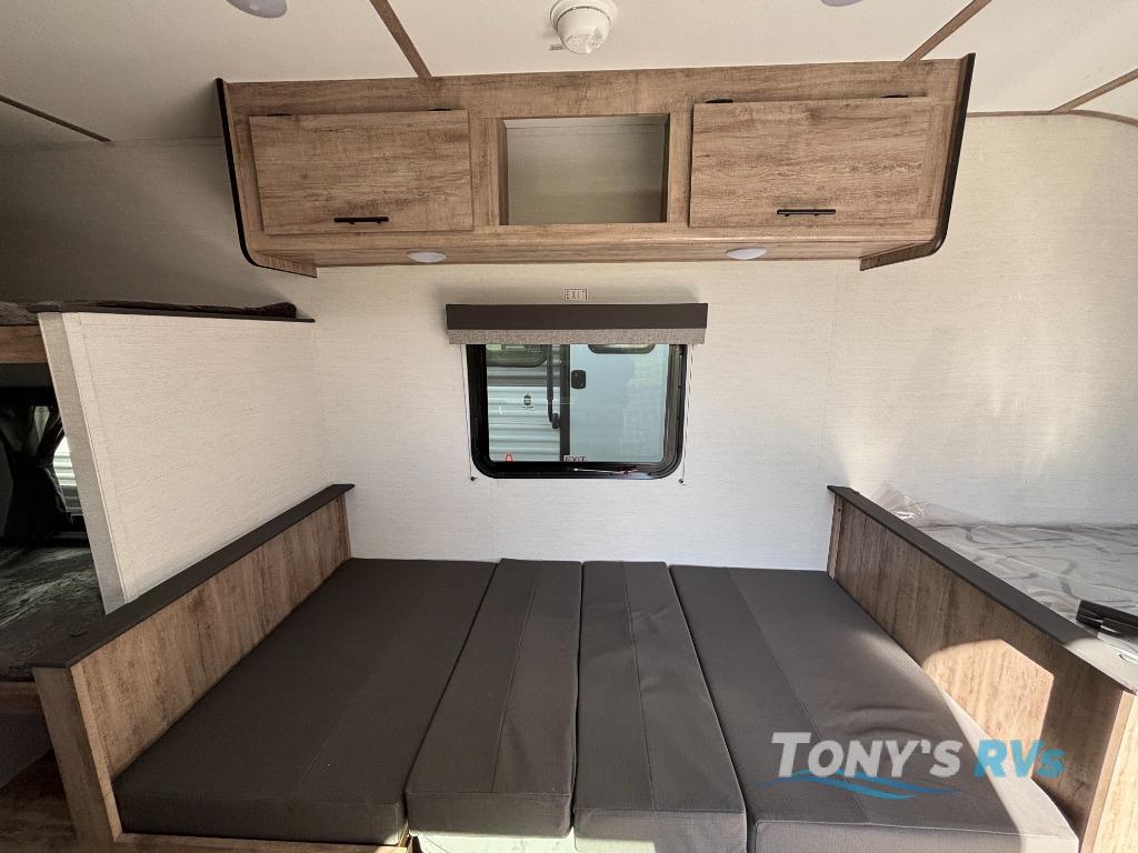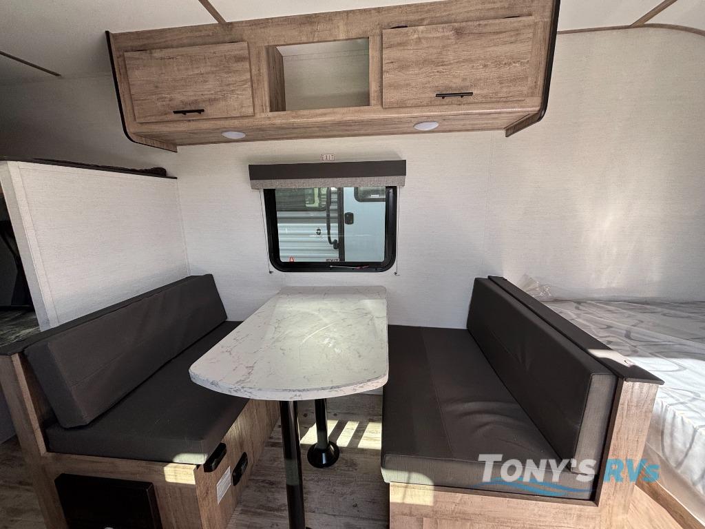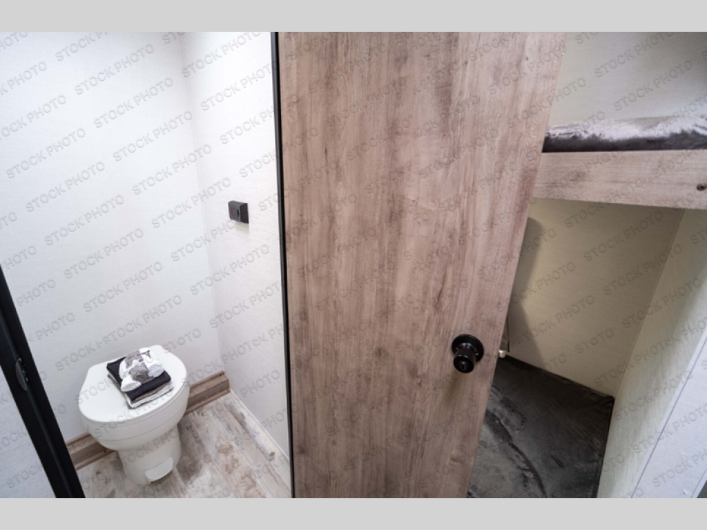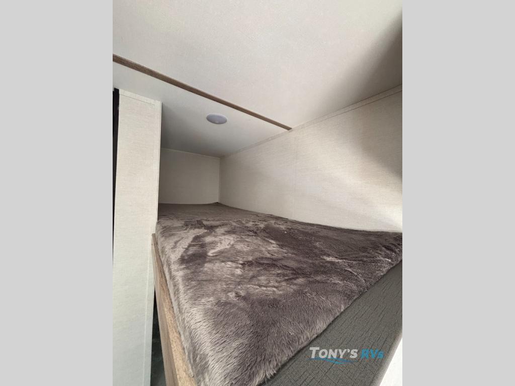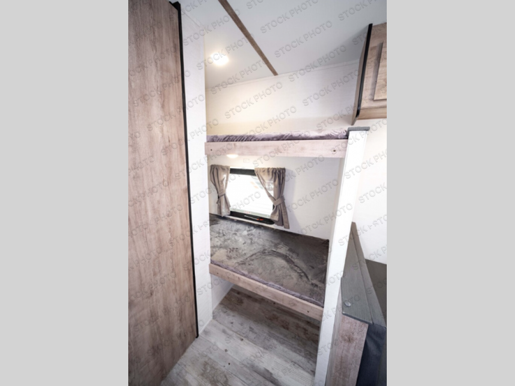 It's easier than ever to enjoy the camping lifestyle with this lightweight travel trailer. There are bunk beds for your guests or little ones, a front bed for you, plus a booth dinette that can double as dining and sleeping space. The private toilet and shower will allow you to stay clean throughout each trip, and since the sink is at the kitchen counter, someone can brush their teeth while the other showers before bed. You will love the fireplace included in this model for a more at-home feel, or you just might find yourselves outdoors under the power awning most of the day!