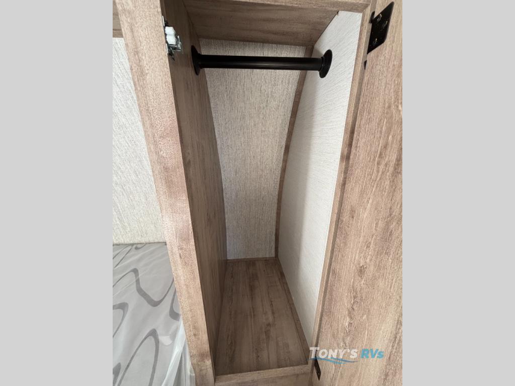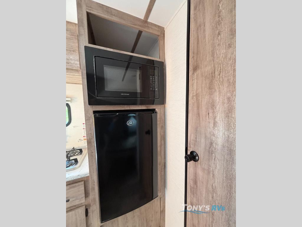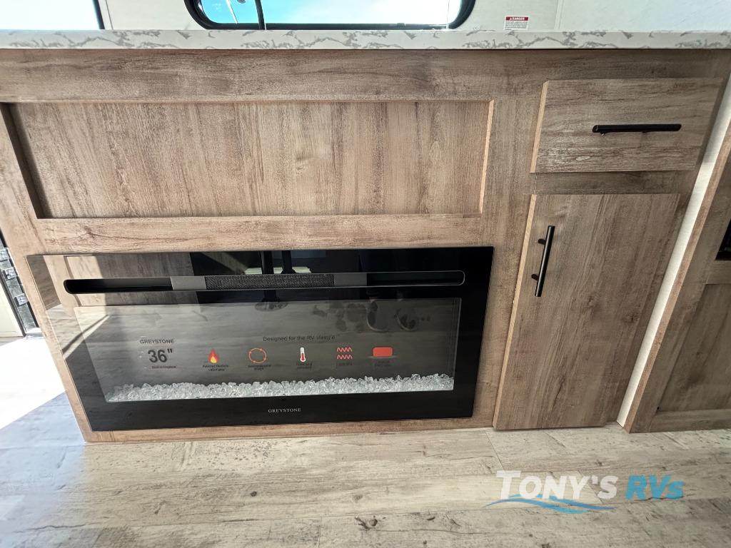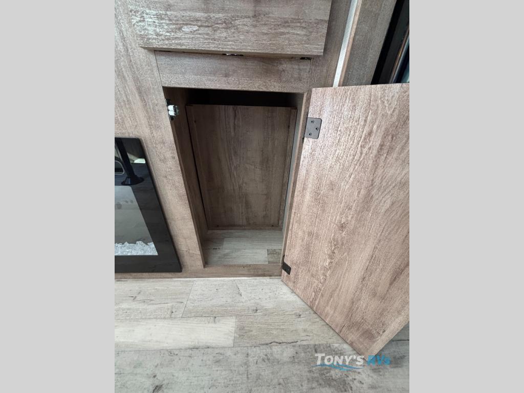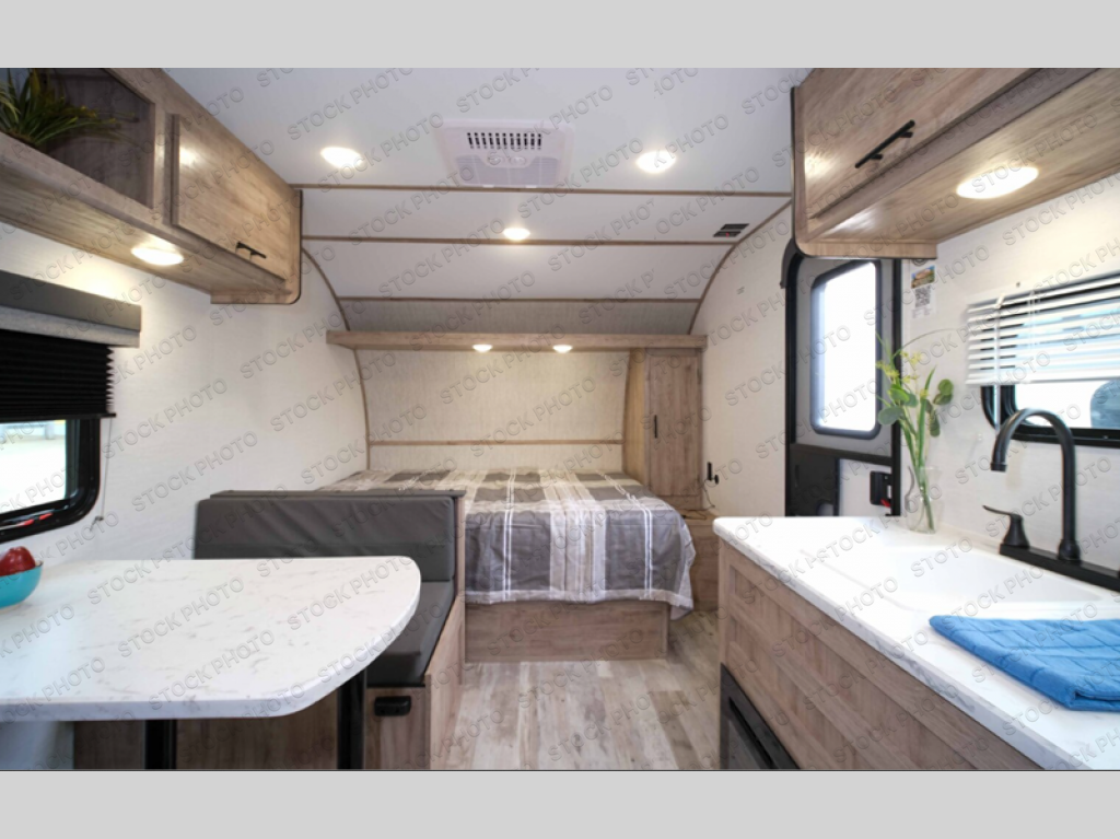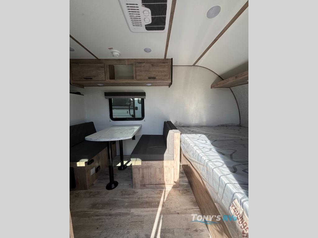 It's easier than ever to enjoy the camping lifestyle with this lightweight travel trailer. There are bunk beds for your guests or little ones, a front bed for you, plus a booth dinette that can double as dining and sleeping space. The private toilet and shower will allow you to stay clean throughout each trip, and since the sink is at the kitchen counter, someone can brush their teeth while the other showers before bed. You will love the fireplace included in this model for a more at-home feel, or you just might find yourselves outdoors under the power awning most of the day!