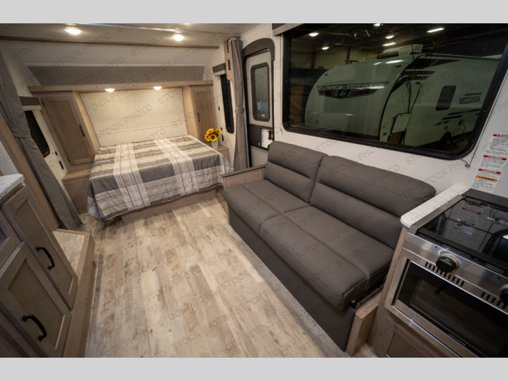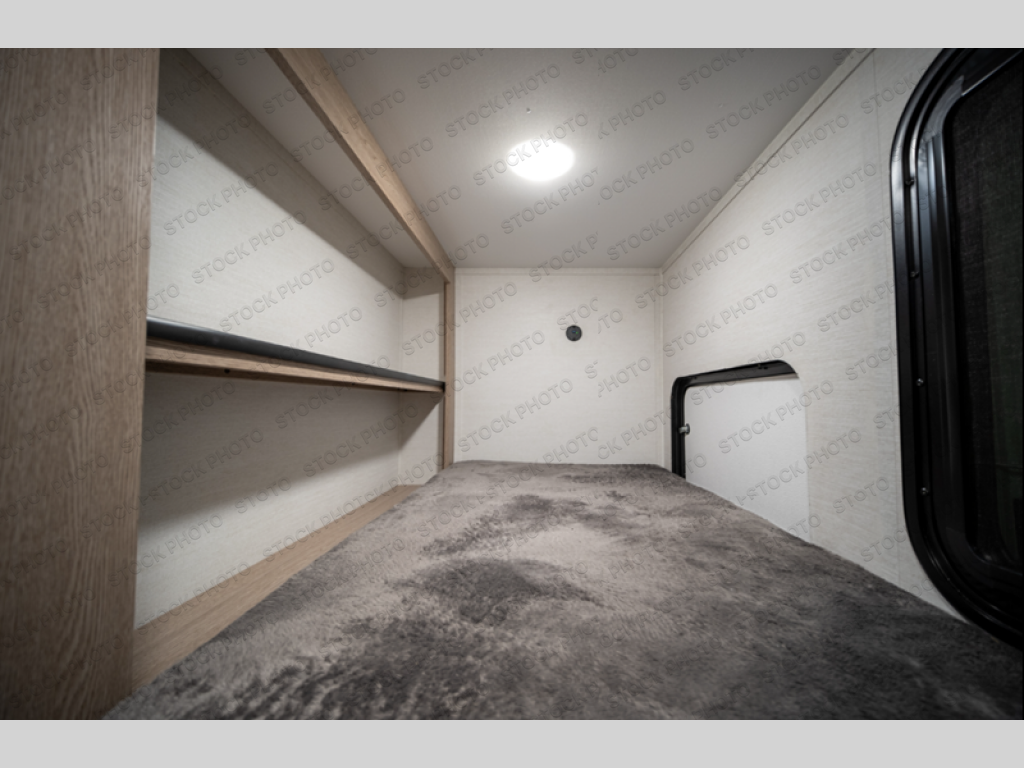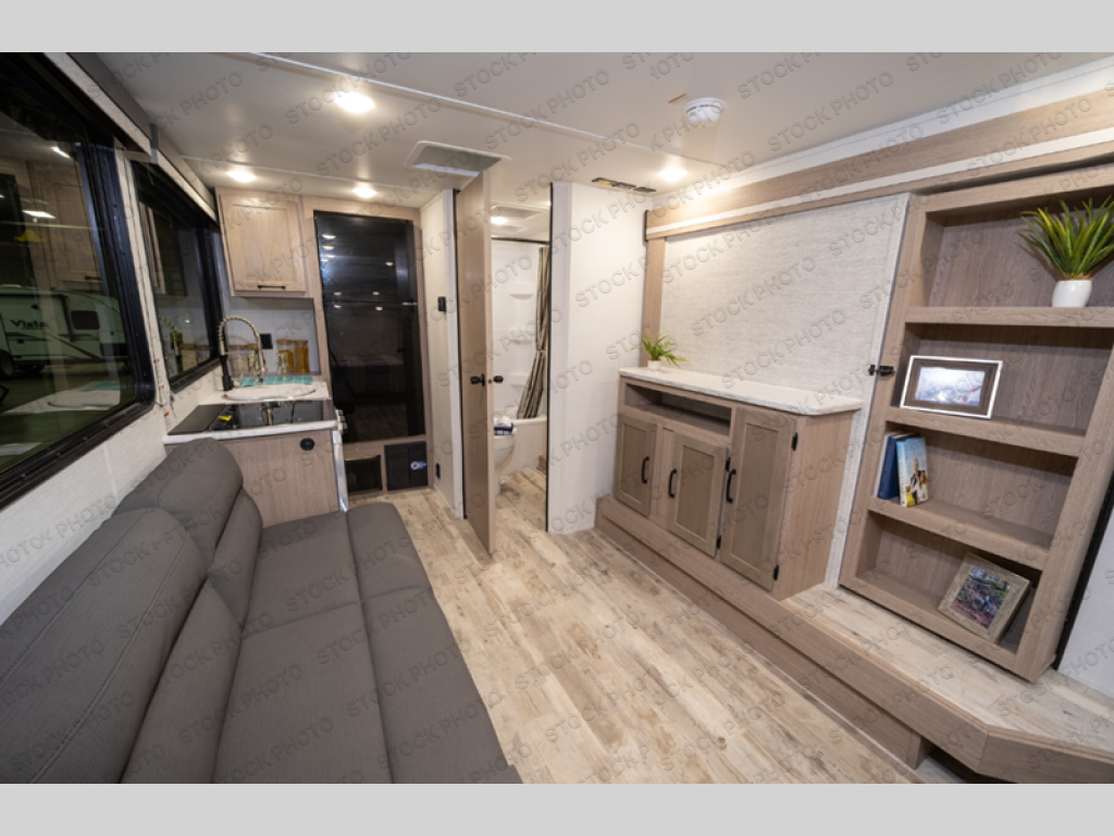 This travel trailer is perfect for a family thanks to its several spaces for rest on the road like the queen bed for you and your partner, the upper and lower bunks for kids, and a folding sofa table for guests, who will also have tons of fun thanks to the entertainment center place In front of the sofa. This unit also has a lot of space to store things and belongings like a shirt closet and wardrobe closet beside the bed, bunk shelves next to the bunk beds, and a sliding overhead cabinet in the kitchen. Also, you will find a refrigerator, sink, and a three-cooktop burner in the kitchen area. Finally, take a relaxing bath in the incredible full bathroom with a skylight