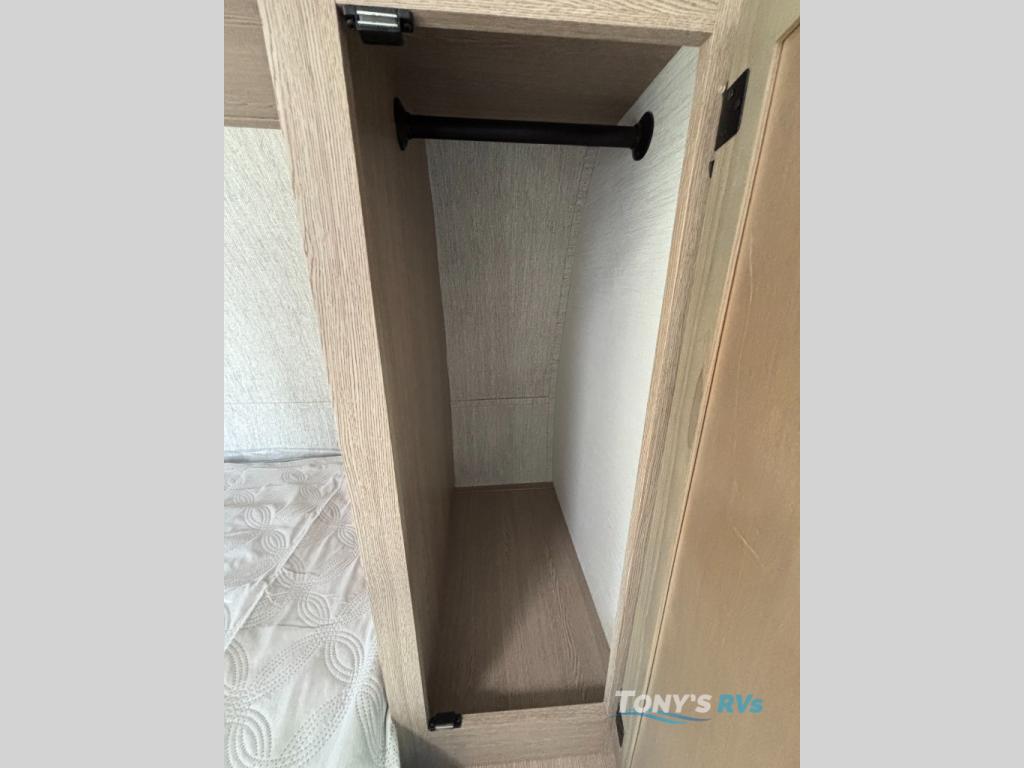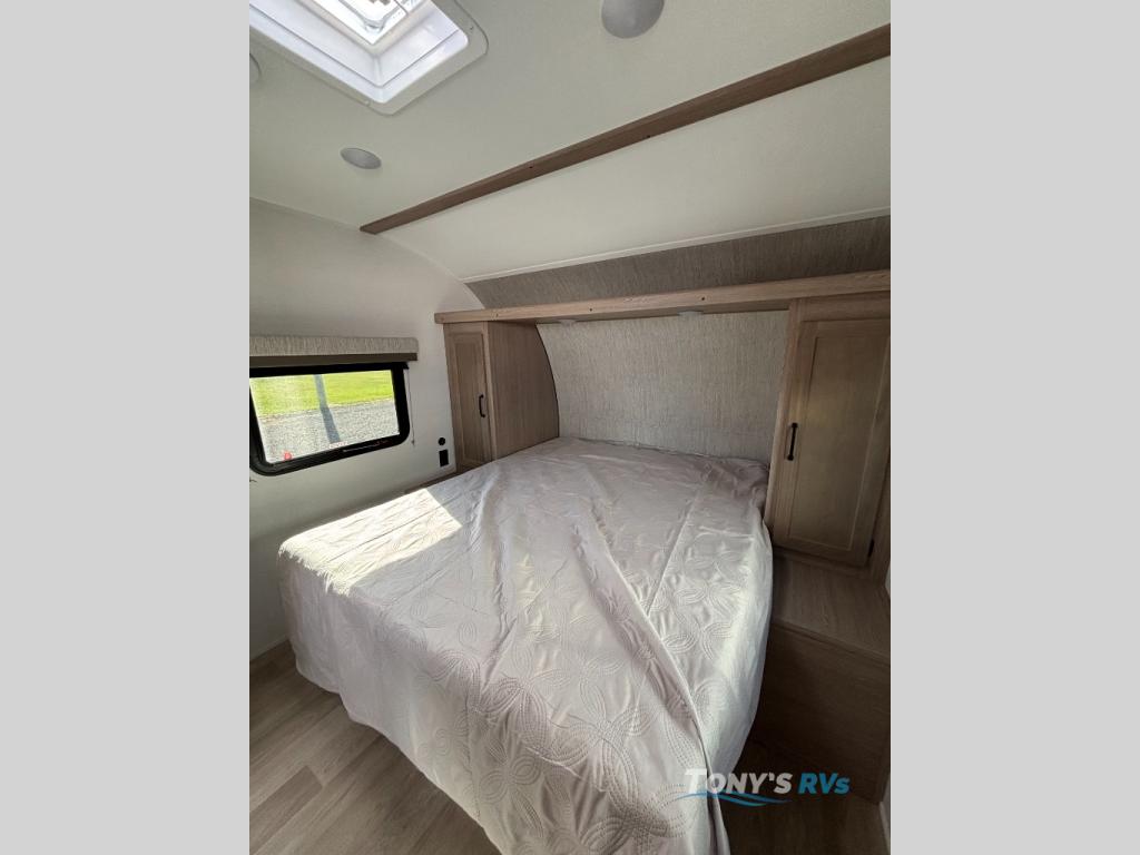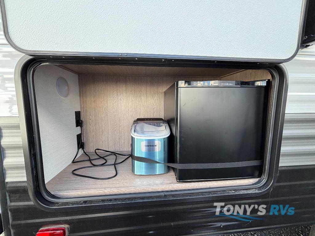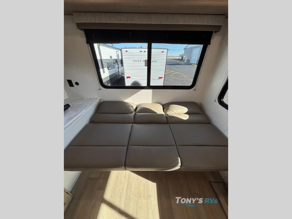 Camping with friends has never been so easy than in this cozy travel trailer. Once you arrive at your destination, prepare lunch on the three burner cooktop and you can dine at the booth dinette. Your guest can make this area their bed at night, along with the jack knife sofa. There is a front master bedroom with a queen bed that will feel just like home, and the two wardrobes provide a place for all your clothes. Head outside to find a pass-through storage, additional outside storage, plus an electric awning with LED lights!