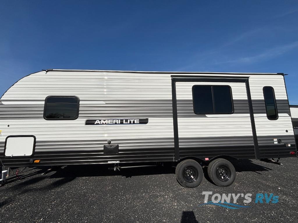 The Ameri-Lite Ultra Lite travel trailers by Gulf Stream are the perfect RV for families wanting to start their camping lifestyle, but not break the bank. These lightweight units are built with a diamond plate lower front, a one-piece synthetic vinyl roof, and a uni-body construction with steel hurricane straps tying the walls to the floor for added durability. The front power hitch jack and four stabilizer jacks will make set-up hassle-free once you arrive at the campground, and you can put out the electric awning to rest in the shade when you're done. Each model includes convenient amenities, like the 13,500 BTU A/C, the tankless water heater, a central control panel, and multiple USB ports for your tablet, phone, and camera! The inside is designed to make you feel at home with radiant LED lighting, designer kitchen backsplash, pleated privacy shades, craft-made cabinetry, plus many more features. Start your RV lifestyle with an affordable, lightweight Ameri-Lite Ultra Lite travel trailer today!
