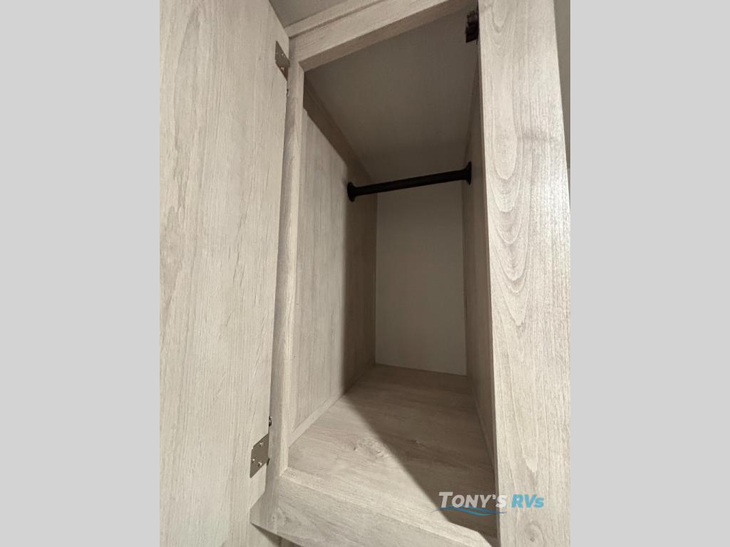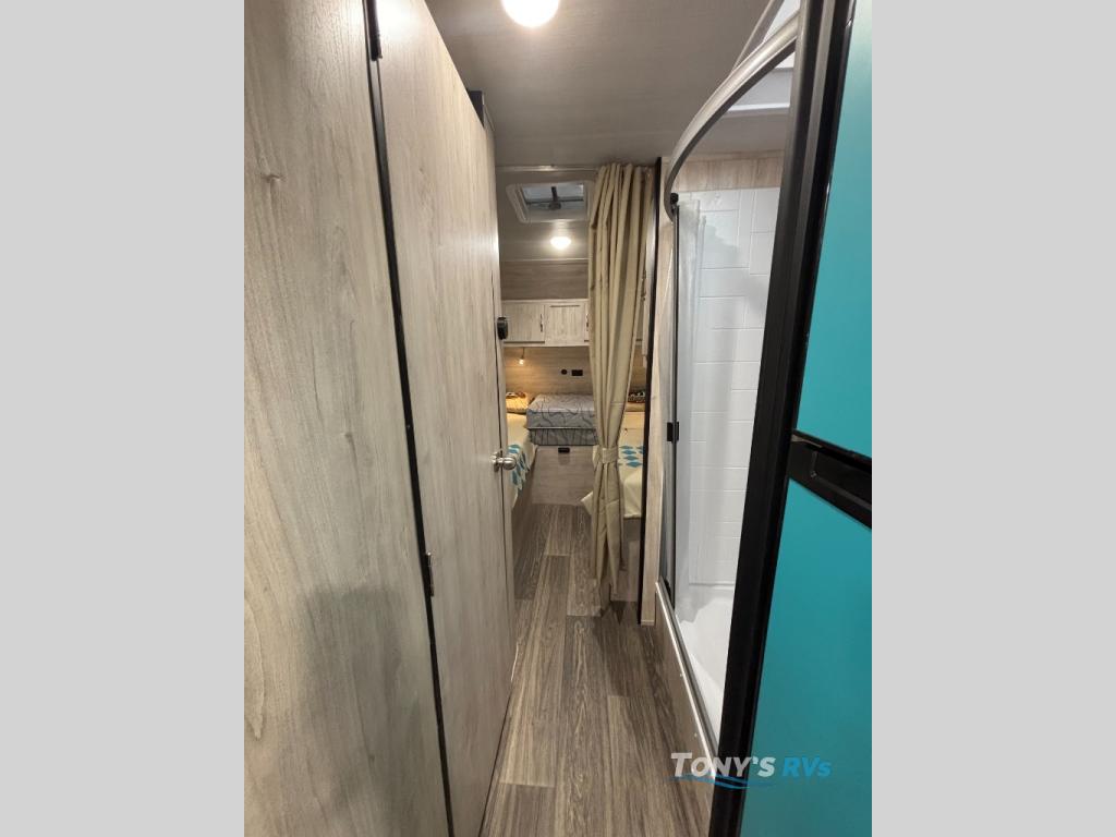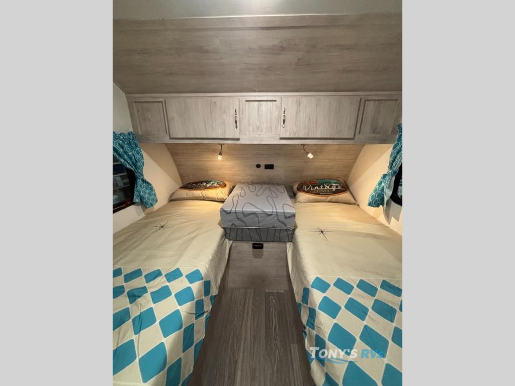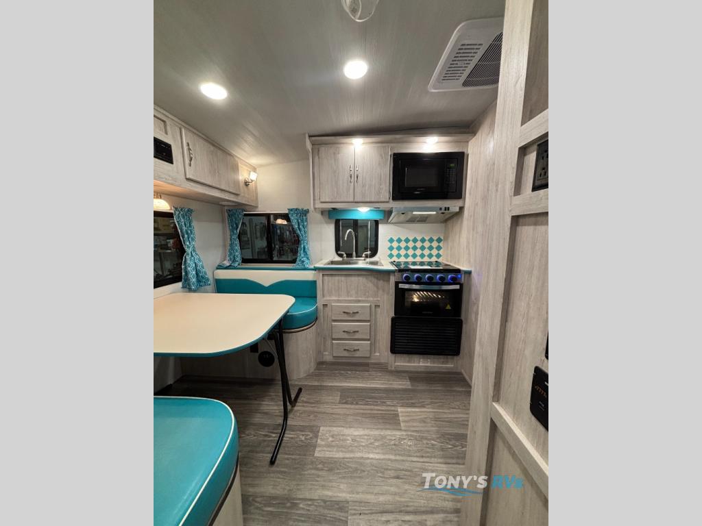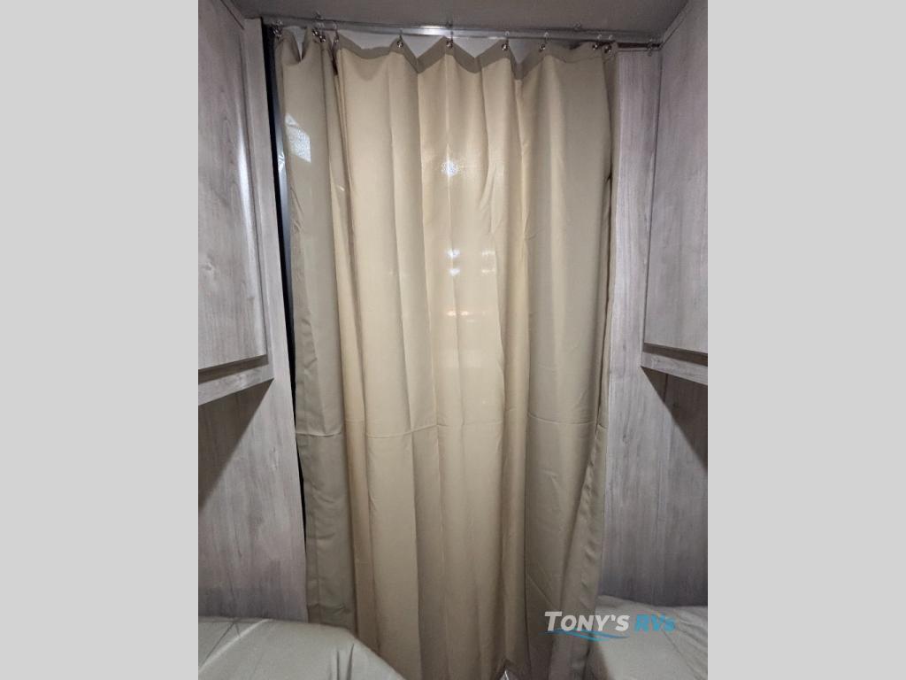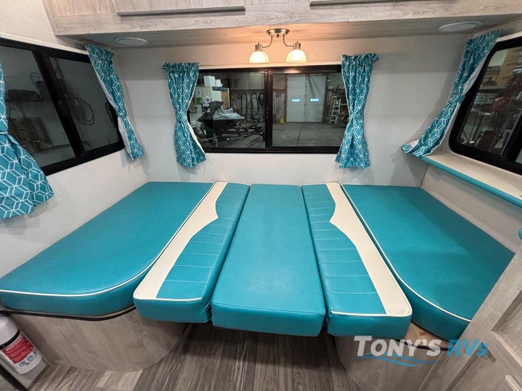 Whether you're camping with a friend or significant other, you'll find this model to be accommodating. There are front twin beds with an insert to make them one king-size bed, plus there are dual shirt closets to keep your clothes off of the floor. The 24" x 36" shower is across from the private toilet and sink so one person can be taking a shower, while the other is brushing their teeth to start the day. Head to the kitchen to prepare breakfast on the cooktop, or use the convenient microwave oven. You will love the rear vintage booth dinette with an extra counter behind one of the seats to set fresh flowers in the window.