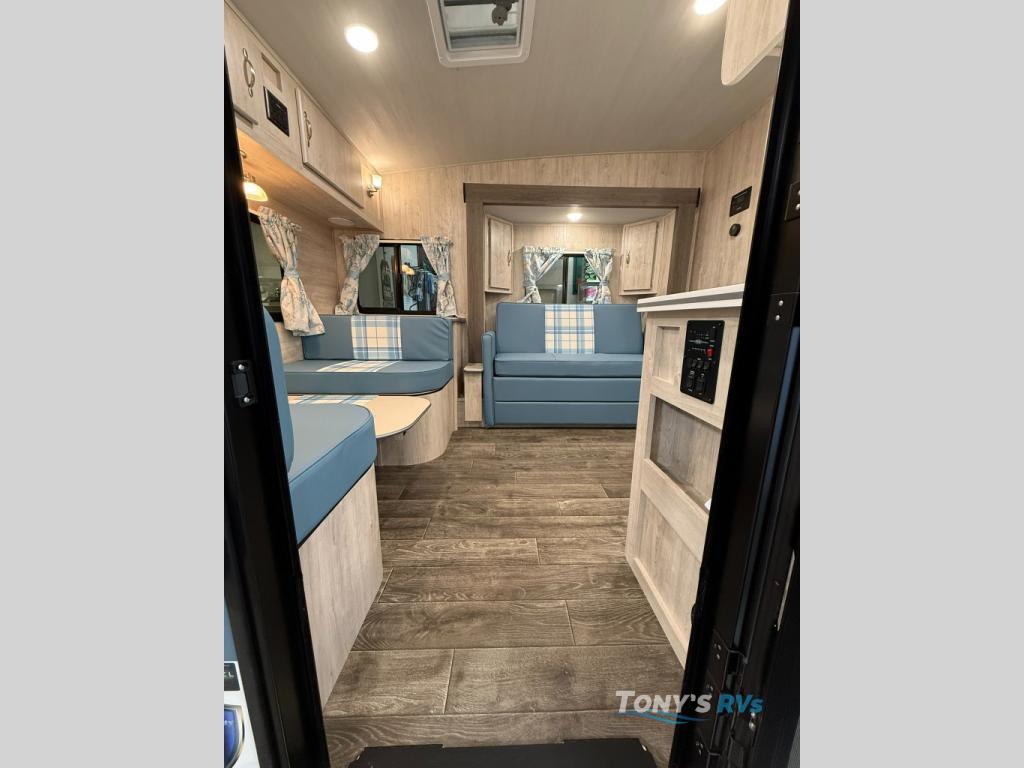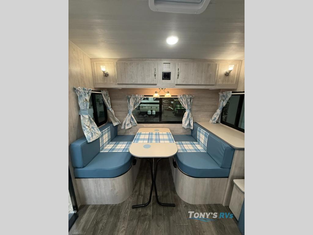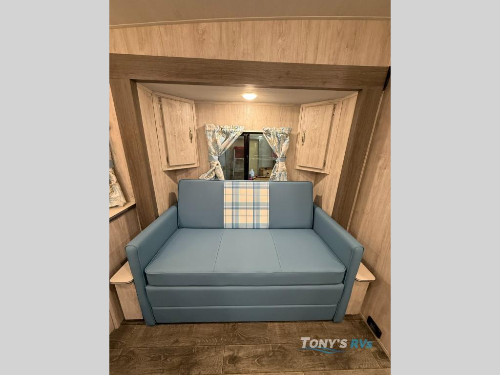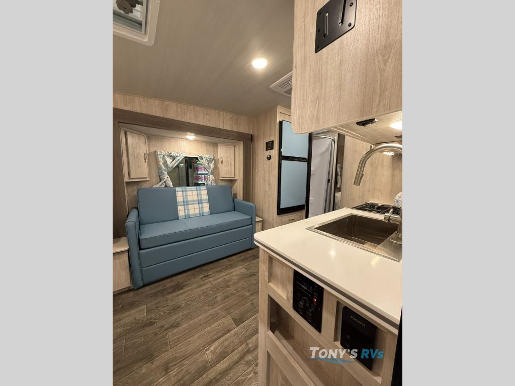 Step into comfort with this classic travel trailer in tow. You will find a rear vintage booth dinette and a sofa slide out with end tables to set your drinks on. The kitchen is complete with a microwave oven, cooktop, plus overhead cabinets for your belongings. After a day outdoors, you can clean up in the 24" x 36" shower, and there is a private toilet and sink across the hall if someone needs to use it while you're cleaning up. This model will feel just like home with its RV queen bed and dual shirt closets for your clothes.