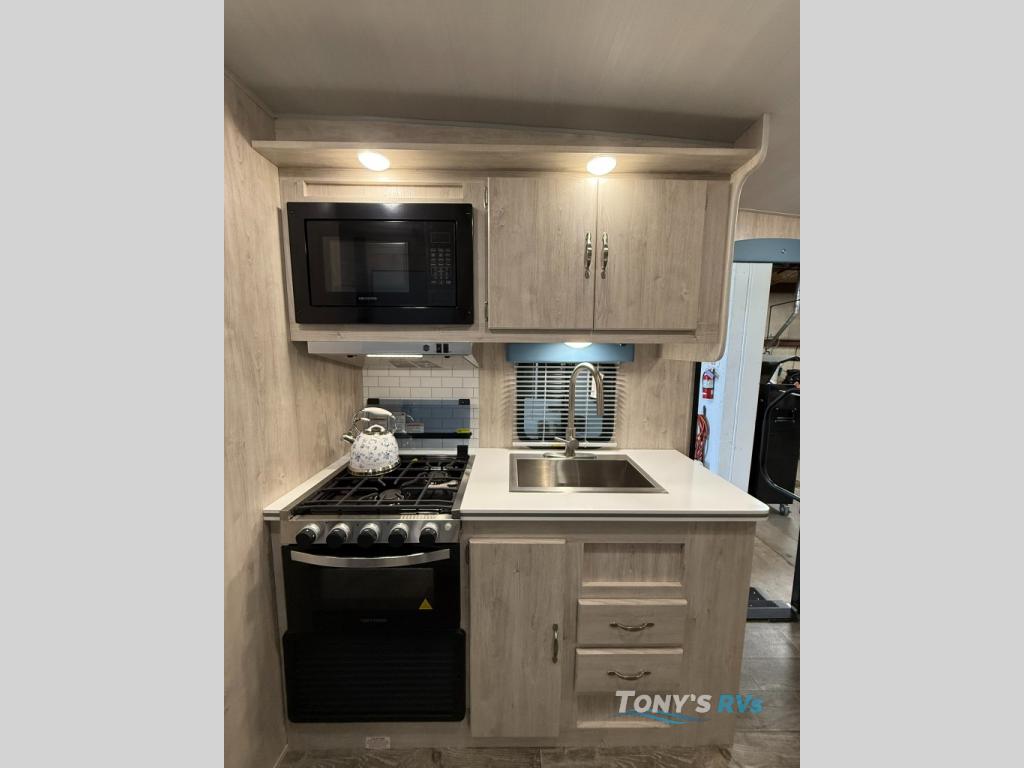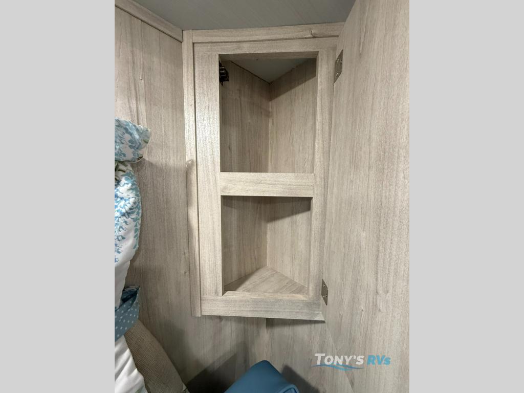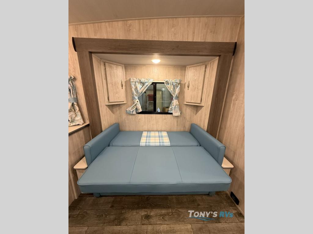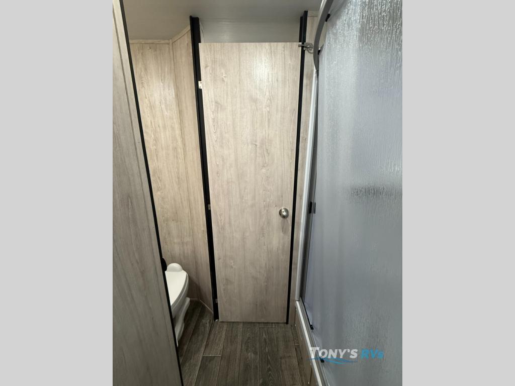 Step into comfort with this classic travel trailer in tow. You will find a rear vintage booth dinette and a sofa slide out with end tables to set your drinks on. The kitchen is complete with a microwave oven, cooktop, plus overhead cabinets for your belongings. After a day outdoors, you can clean up in the 24" x 36" shower, and there is a private toilet and sink across the hall if someone needs to use it while you're cleaning up. This model will feel just like home with its RV queen bed and dual shirt closets for your clothes.