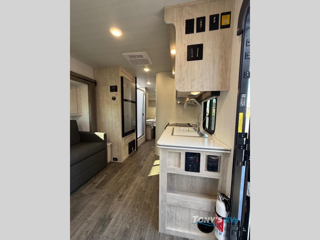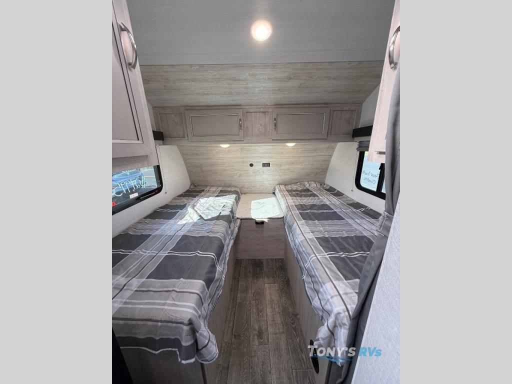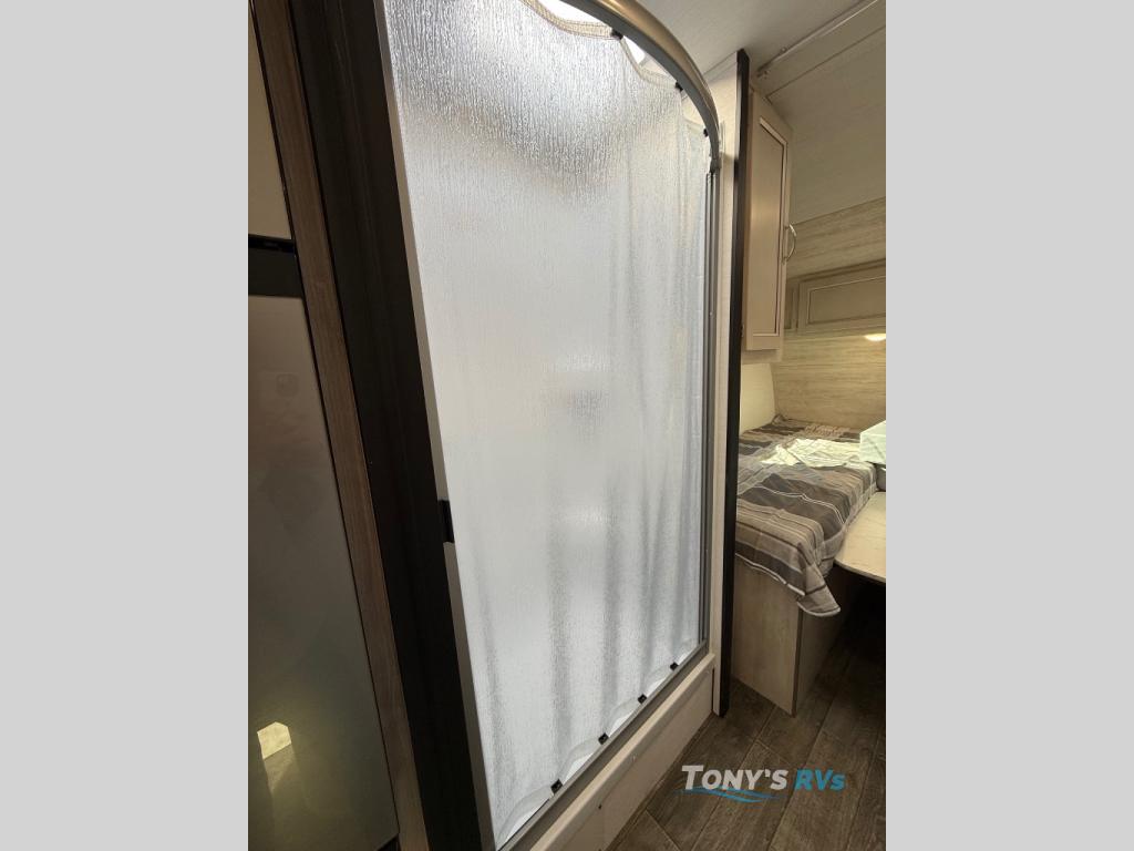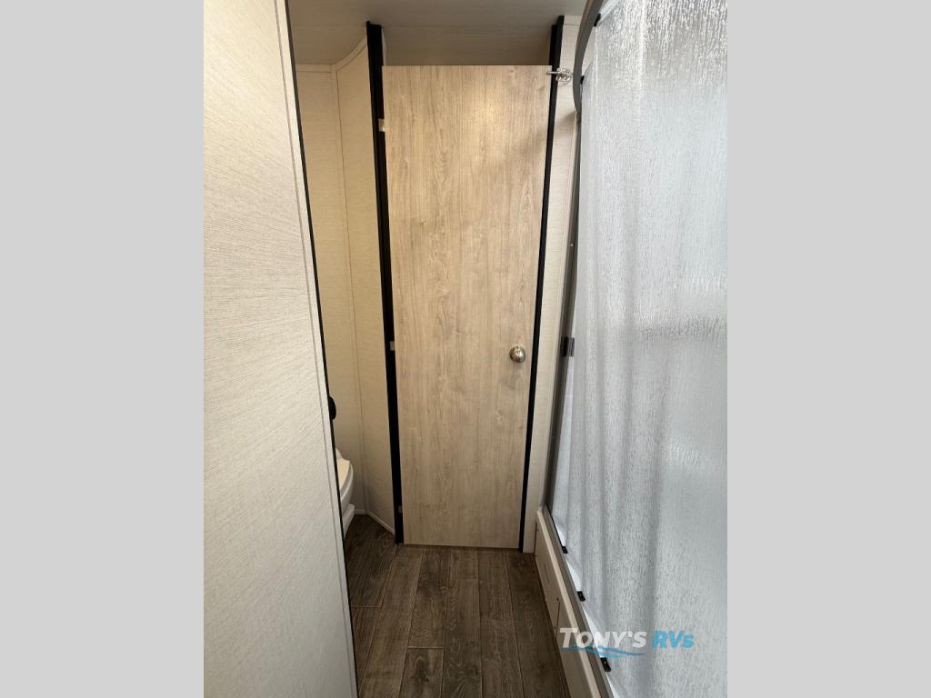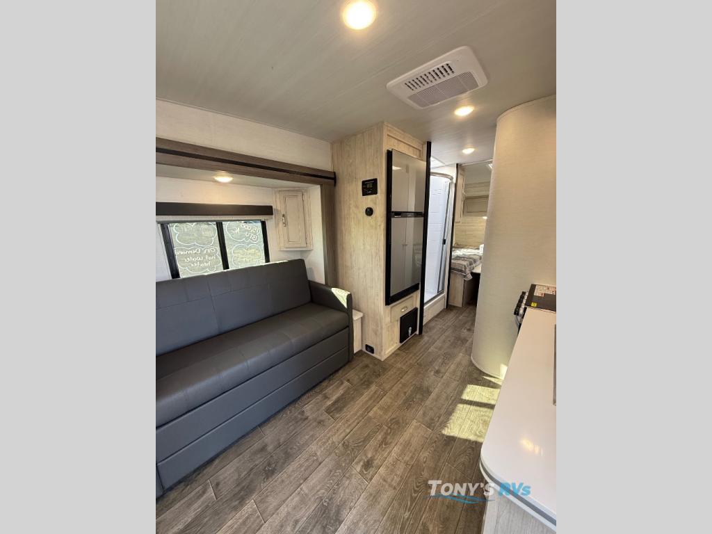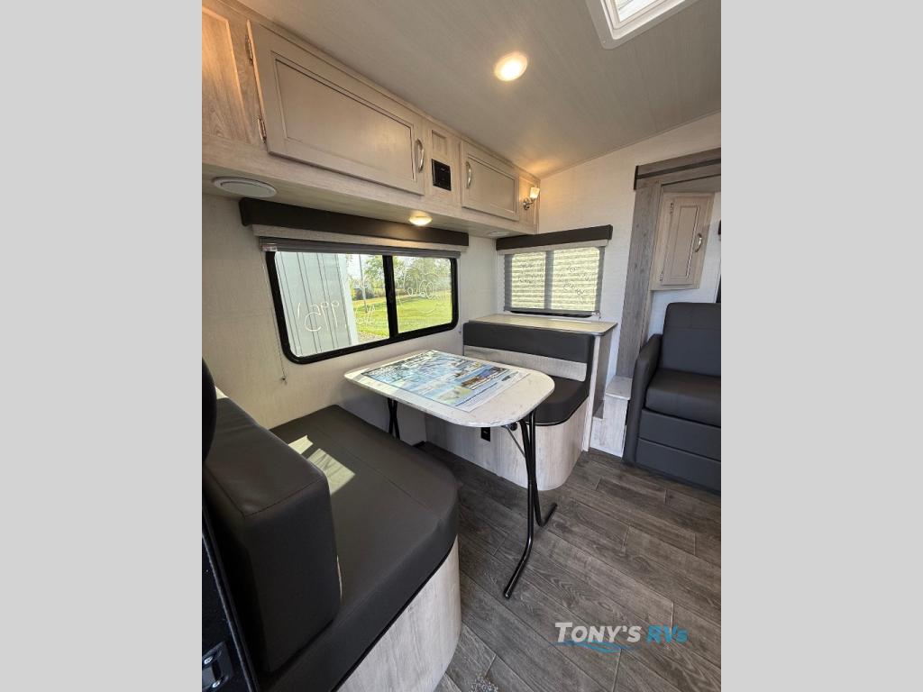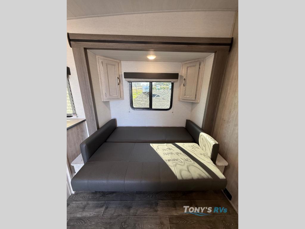 You will appreciate how versatile this travel trailer is! It features two front 32" x 80" twin beds with an insert for a king bed, plus a night stand with a drawer to keep your valuables secure. The separated bathroom allows one person to rinse the sand out of their hair in the shower while another uses the private lavatory and sink. The booth dinette is not only great for enjoying a meal or playing a card game, but also for transforming into an extra sleeping space. The sofa slide can also be another sleeping space, and the flat floor entry helps keep everyone from tripping as they enter or exit!