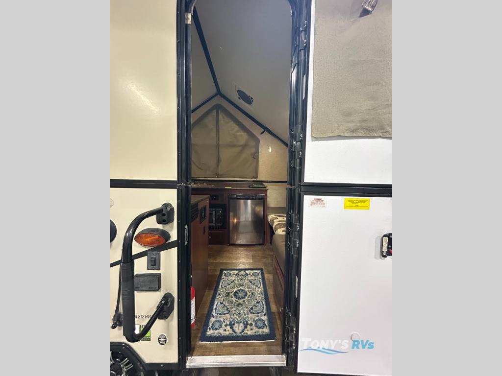 As you enter the A212HW Rockwood Hard Side folding pop-up camper by Forest River, you will find that there is a 50" x 80" front dinette. Along one side of the camper there is a XL refrigerator, double kitchen sink, and microwave. Across from the sink you will find a three burner range and oven. Along the rear of the camper you can enjoy a good night's rest on the 60" x 80" flip-up bed with a heated mattress!