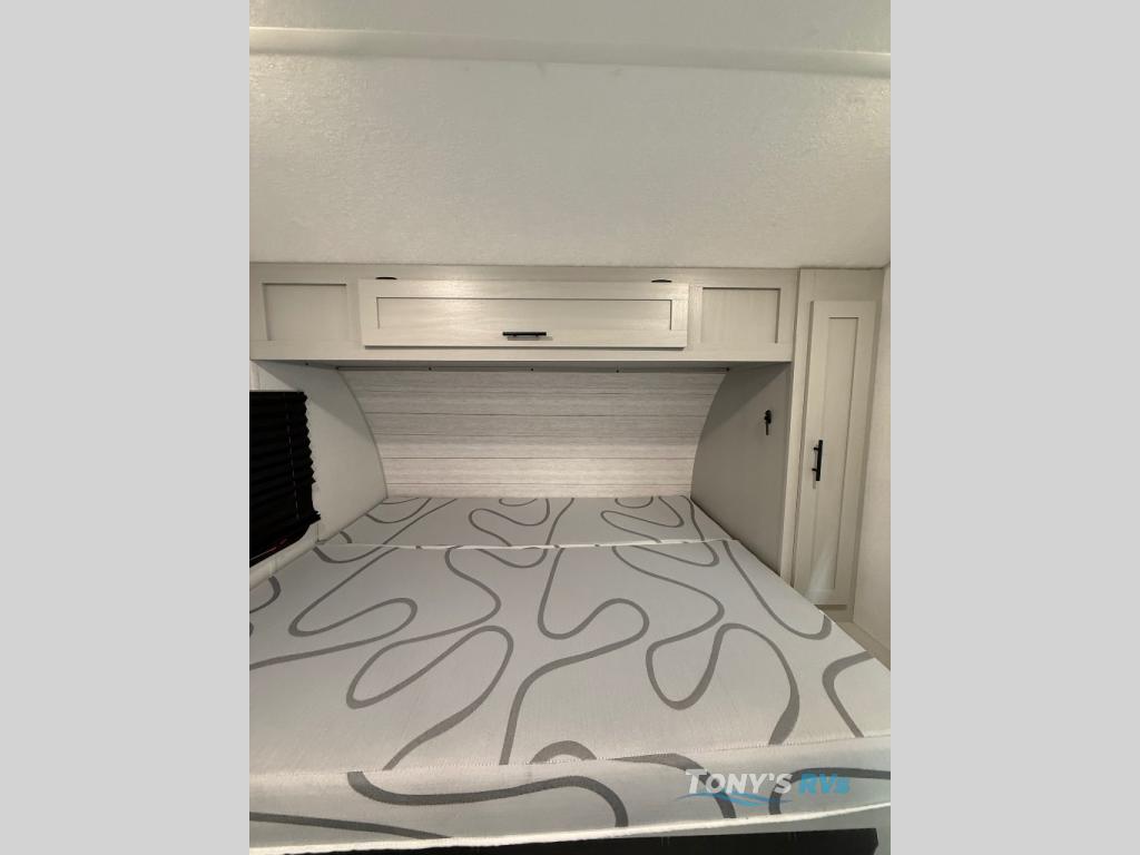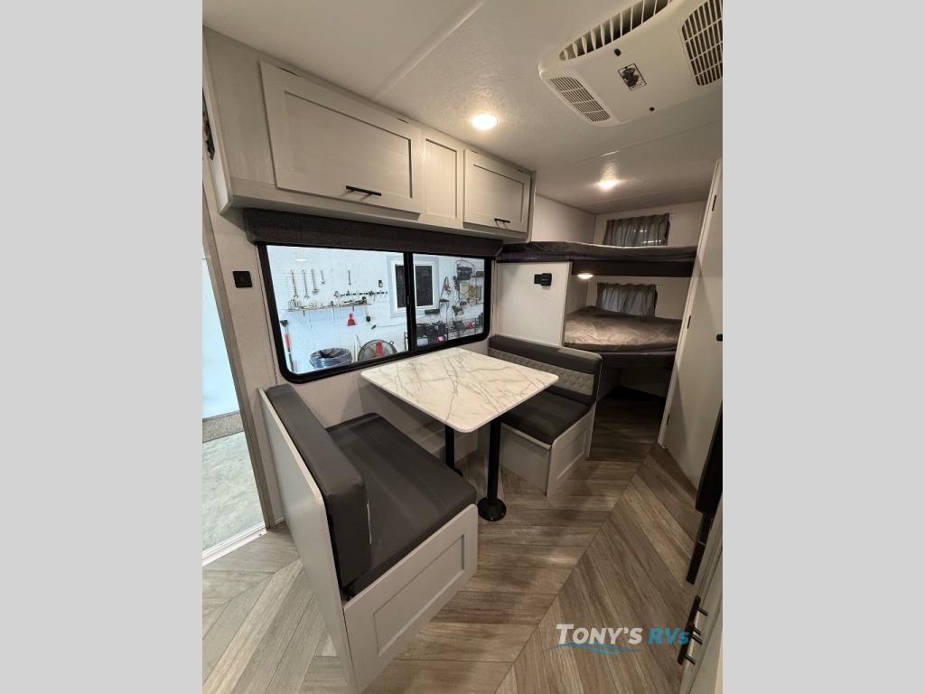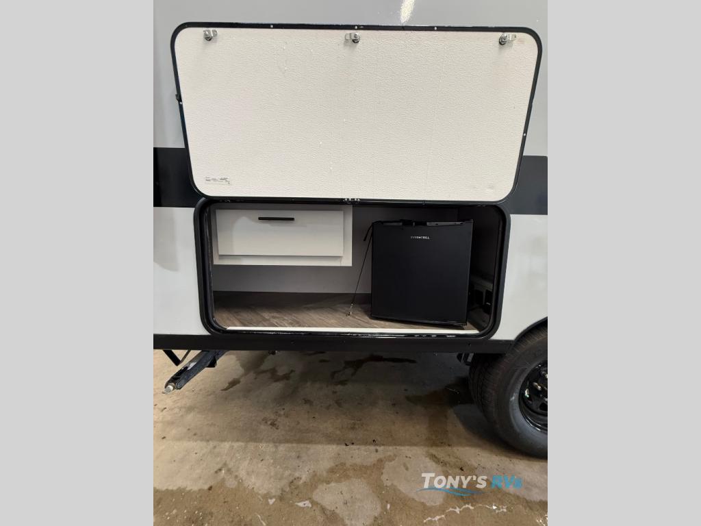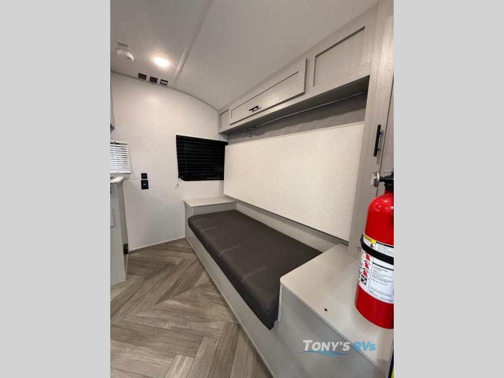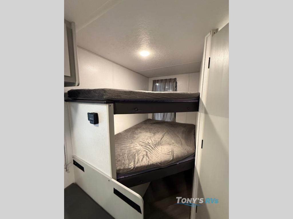 How would having an outdoor 1.6-cu. ft. refrigerator with an optional LP griddle and a 14' power awning with adjustable legs sound with your next trailer? You will also find full pass-through storage for your fishing poles, charcoal, and camping chairs. Inside, you can sleep on your own RV queen Murphy bed at night, and relax on the booth dinette during the day. The double-size bunks with storage will be perfect for extra travelers, and the full bathroom will keep everyone refreshed for the next activity. And don't forget about the USB charging outlets, the upgraded appliance package, and the panoramic window.