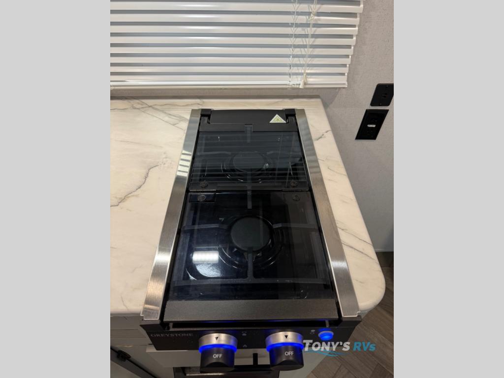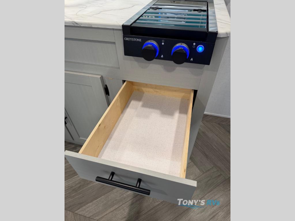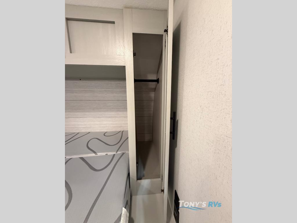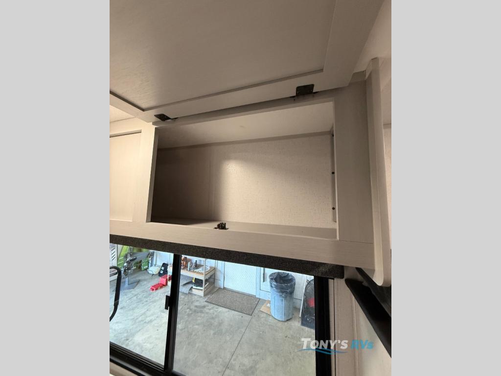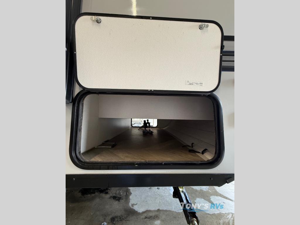 How would having an outdoor 1.6-cu. ft. refrigerator with an optional LP griddle and a 14' power awning with adjustable legs sound with your next trailer? You will also find full pass-through storage for your fishing poles, charcoal, and camping chairs. Inside, you can sleep on your own RV queen Murphy bed at night, and relax on the booth dinette during the day. The double-size bunks with storage will be perfect for extra travelers, and the full bathroom will keep everyone refreshed for the next activity. And don't forget about the USB charging outlets, the upgraded appliance package, and the panoramic window.